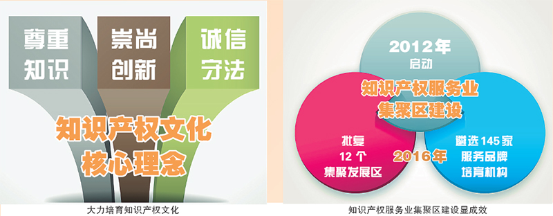 2012年11月,国家知识产权局牵头制定并联合发展改革委等9部门发布了《关于加快培育和发展知识产权服务业的指导意见》,全面规划和系统部署了知识产权服务业发展工作。同时,国家知识产权局会同有关部门积极完善知识产权服务标准体系,加快建设知识产权服务业集聚区。2012年,国家知识产权局启动了国家知识产权服务业发展试验区建设工作,到2016年底共批复建设了北京中关村、上海漕河泾、苏州高新区等12个知识产权服务业集聚发展区,遴选了145家知识产权服务品牌培育机构。