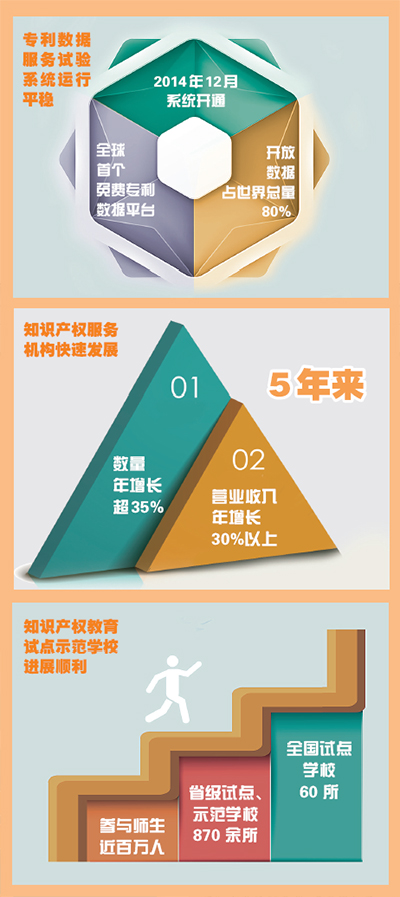 同时,国家知识产权局还不断创新服务方式,组织开展知识产权服务品牌机构牵手经济发展以及助力“双创”等系列活动、“知识产权走基层 服务经济万里行”活动,让社会公众感受到了知识产权服务带来的实实在在的好处。