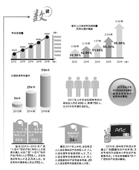 有数据证实,五年来广西专利主要指标呈井喷式增长:2012年全区共申请专利13605件,2016年增至59231件;2012年获专利授权5902件,2016年增至14852件;2012年每万人口发明专利拥有量为0.56件,2016增至3件……