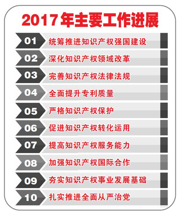 2017年各项成绩的取得,是党中央、国务院正确领导的结果,是各部门各地方大力支持的结果,是全系统干部职工团结奋斗的结果,是全社会积极参与的结果。在此,我谨代表国家知识产权局,向兄弟部门和社会各界,向全系统广大干部职工表示衷心的感谢!