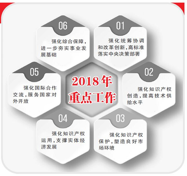 2018年,是贯彻党的十九大精神的开局之年,是改革开放四十周年,是决胜全面建成小康社会、实施“十三五”规划承上启下的关键一年。今年工作的总体要求是:全面贯彻党的十九大精神,以习近平新时代中国特色社会主义思想为指导,加强党对知识产权事业的领导,认真落实党中央、国务院决策部署,紧扣我国社会主要矛盾变化,牢牢把握稳中求进工作总基调,坚持新发展理念,按照高质量发展的要求,深入实施知识产权战略,深化知识产权领域改革,大力倡导创新文化,强化知识产权创造、保护、运用,加快知识产权强国建设,奋力开创新时代知识产权事业改革发展新局面。