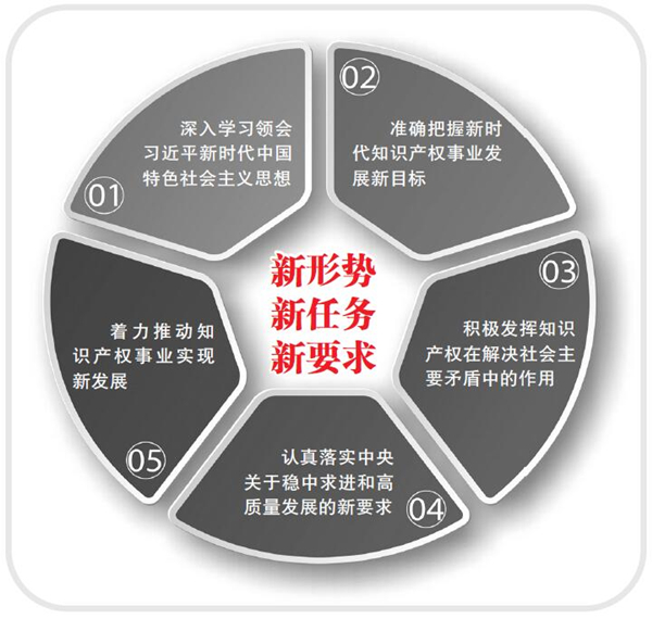 五是着力推动知识产权事业实现新发展。党的十九大报告指出,发展是解决我国一切问题的基础和关键。实现两个“一百年”奋斗目标、实现中华民族伟大复兴的中国梦,必须坚定不移地把发展作为党执政兴国的第一要务。知识产权事业是党和国家事业的有机组成部分。我们必须以新发展理念为引领,强化发展的意识,增强发展的本领,不断开创知识产权事业发展新局面。要紧紧围绕完善基本经济制度、支撑创新发展、促进全面开放等战略重点,加快实现知识产权事业发展的“五个转变”,助推现代化经济体系建设。